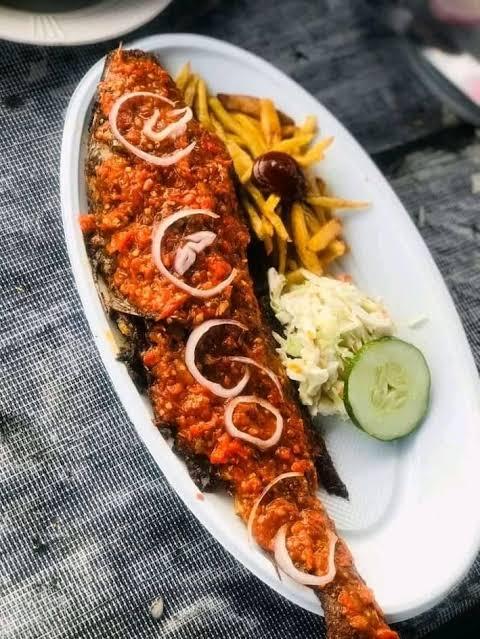 Yummy Barbecue Fish: A grilled fish with servings (coleslaw and chips)